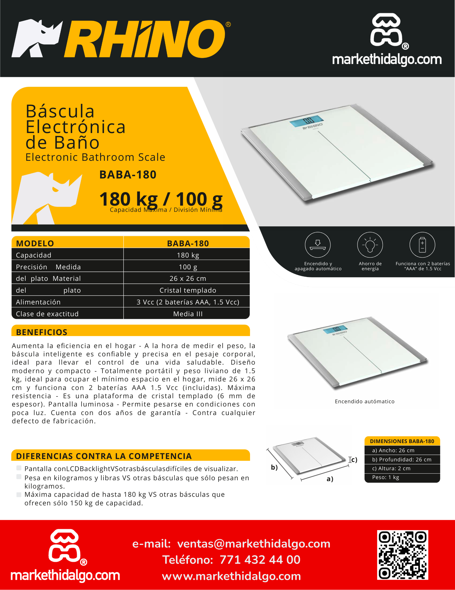 Báscula Inteligente de Salud Transforma tu bienestar con precisión y tecnología avanzada. Características principales: La báscula inteligente ofrece una medición precisa y confiable del peso corporal y más. Además de calcular el peso, te permite obtener datos esenciales sobre tu salud, como el Índice de Masa Corporal (IMC), porcentaje de grasa corporal (%GC), tasa metabólica basal (TMB) y más. Con conectividad Bluetooth 4.0, puedes controlar todos estos datos desde una app en tu dispositivo móvil. Beneficios destacados: • Mediciones completas de salud: Calcula IMC, porcentaje de grasa corporal, tasa metabólica basal, nivel de agua corporal, edad corporal, masa muscular, y masa esquelética. • Conectividad Bluetooth 4.0: Se conecta fácilmente a tu dispositivo móvil para un control completo desde la app. • Pantalla luminosa: Su pantalla LCD Backlight permite ver claramente los resultados, incluso en ambientes con poca luz. • Fácil de usar: Funciona con 2 baterías AAA de 1.5 Vcc (incluidas), lo que la hace ideal para uso en cualquier lugar del hogar. • Garantía de 2 años: Respaldo contra defectos de fabricación, asegurando durabilidad y tranquilidad. ¡Controla tu salud con tecnología avanzada! Mide y analiza tu bienestar de manera precisa con la báscula inteligente. ¡Obtén la tuya ahora y lleva tu salud al siguiente nivel!