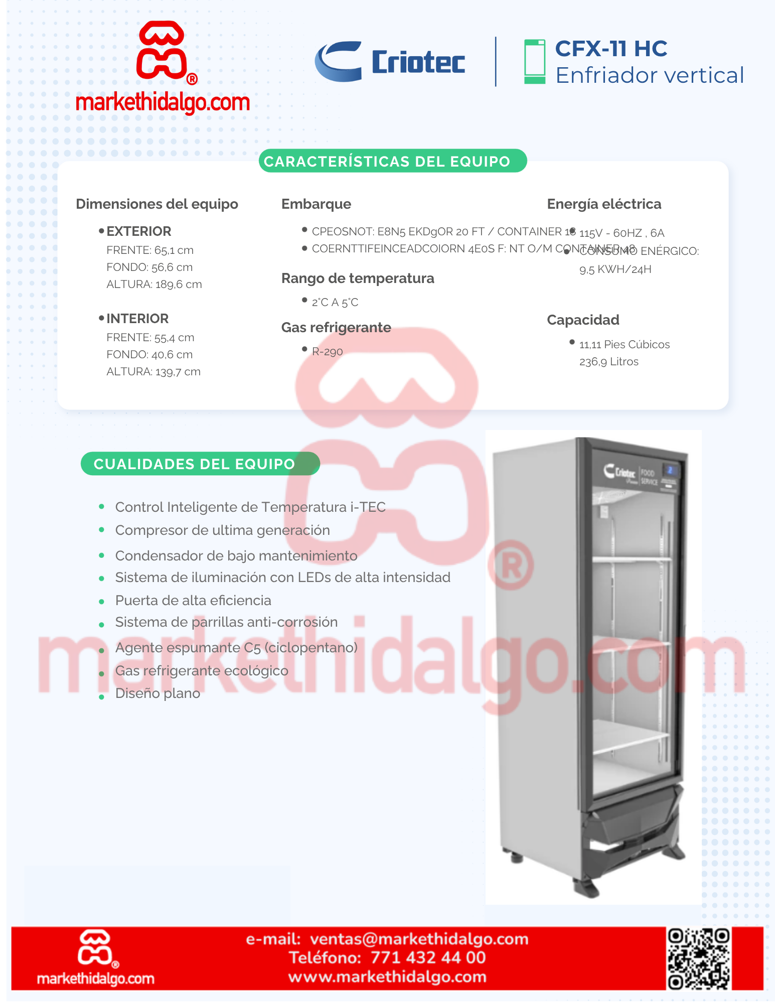 CFX-11 "Eficiencia ecológica con tecnología de vanguardia" Características principales: El enfriador vertical modelo CFX-11 combina tecnología avanzada y diseño moderno para garantizar un rendimiento superior. Ideal para negocios que buscan eficiencia energética y sostenibilidad. Beneficios destacados: • Control Inteligente de Temperatura i-TEC: Ahorro de energía con regulación precisa y eficiente. • Compresor de última generación: Máximo rendimiento con menor consumo eléctrico. • Condensador de bajo mantenimiento: Reducción de costos operativos y mayor durabilidad. • Sistema de iluminación LED de alta intensidad: Visibilidad óptima con menor consumo energético. • Puerta doble de alta eficiencia: Conservación de temperatura y menor intercambio térmico. • Parrillas anticorrosión: Mayor resistencia y durabilidad en ambientes húmedos. • Aislamiento ecológico con agente C5: Contribuye al cuidado del medio ambiente. • Diseño plano moderno: Ideal para cualquier espacio, con una estética atractiva. Uso: Perfecto para comercios, restaurantes y tiendas que requieren almacenamiento eficiente y seguro de alimentos o bebidas, optimizando el consumo energético. ¡Haz más eficiente tu negocio! Incorpora el CFX-11 y disfruta de un enfriador confiable, ecológico y duradero.