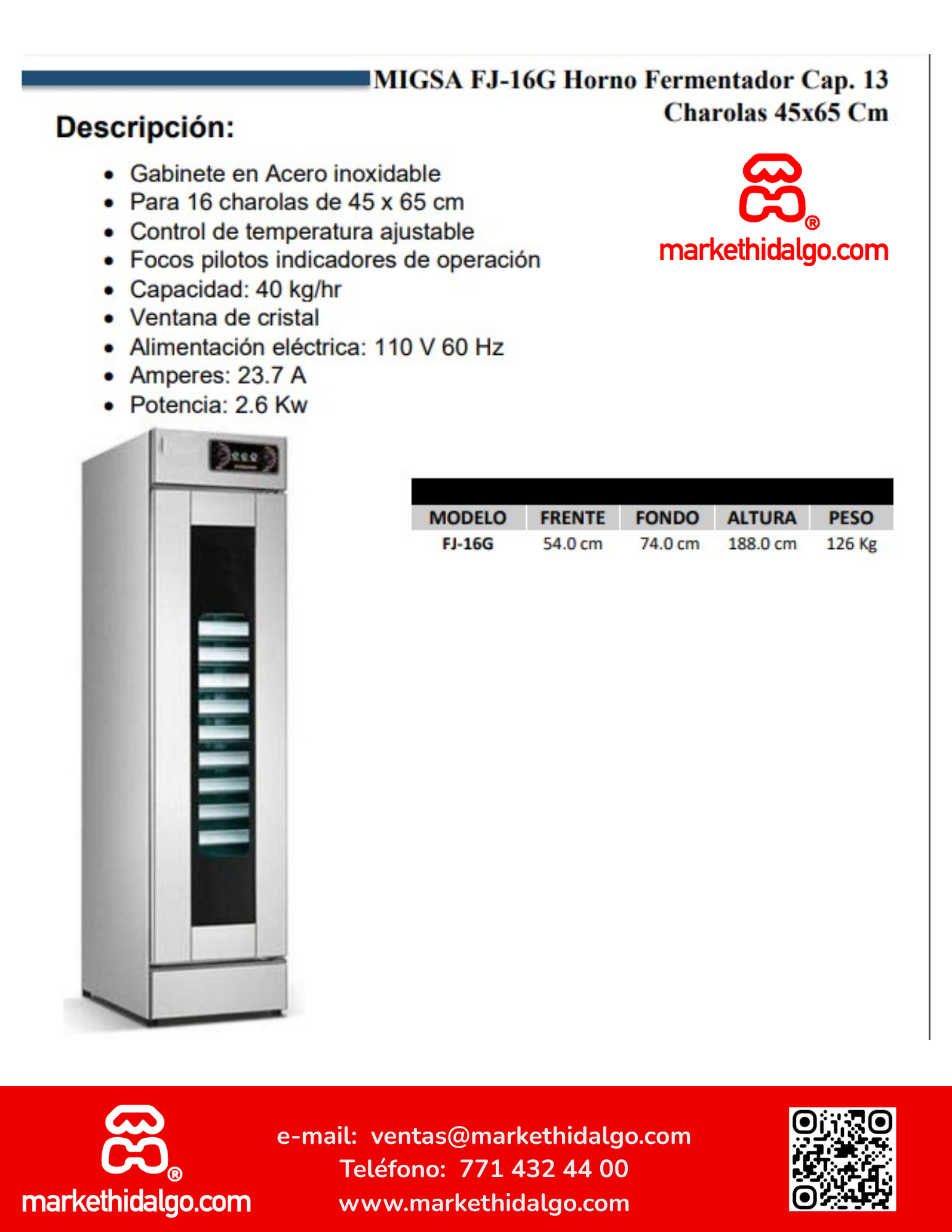 Fermentadora MIGSA FJ-16G Capacidad y precisión para una fermentación perfecta, ideal para producción continua. Características principales: La fermentadora MIGSA FJ-16G es una excelente opción para negocios que necesitan un control preciso en el proceso de fermentación. Con capacidad para 16 charolas de 44 x 65 cm y un diseño robusto en acero inoxidable, esta fermentadora garantiza eficiencia y confiabilidad. Beneficios destacados: • Gran capacidad: Acomoda hasta 16 charolas (44 x 65 cm), ideal para grandes volúmenes de productos. • Control de temperatura ajustable: Permite regular la temperatura para asegurar condiciones óptimas de fermentación. • Eficiencia y alta capacidad: Puede manejar hasta 40 kg/h, lo que permite una producción continua. • Construcción resistente: Hecha de acero inoxidable, ofrece durabilidad, higiene y facilidad de mantenimiento. • Ventana de cristal: Permite observar el proceso sin abrir la unidad, manteniendo la temperatura interna constante. Uso: Perfecta para panaderías, fábricas de masa y otros negocios de alimentos que requieren un proceso de fermentación controlado y a gran escala. ¡Asegura una fermentación precisa y optimiza tu producción con la fermentadora MIGSA FJ-16G!