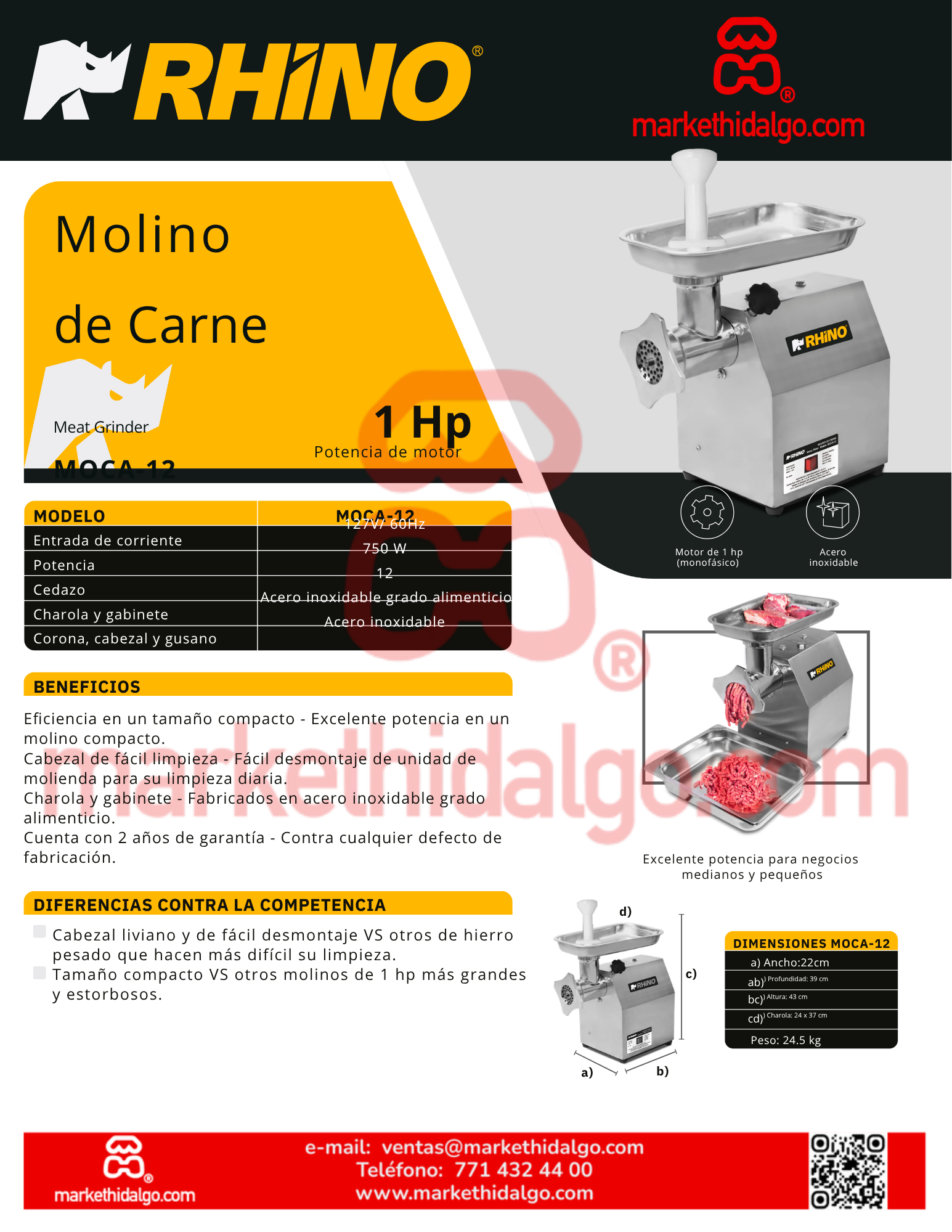 MOCA-12 Optimiza el proceso de molienda con el MOCA-12, un molino compacto que ofrece una excelente potencia en un diseño reducido, ideal para espacios limitados sin sacrificar rendimiento. Su cabezal liviano y fácil de desmontar facilita la limpieza diaria, garantizando eficiencia y durabilidad. Fabricado en acero inoxidable grado alimenticio, el MOCA-12 asegura higiene superior, evitando la transferencia de olores y facilitando su mantenimiento. Beneficios destacados: Eficiencia en espacio reducido: Ideal para negocios que requieren potencia sin ocupar mucho espacio. Fácil limpieza: Cabezal desmontable para facilitar la limpieza diaria. Durabilidad: Construcción en acero inoxidable de grado alimenticio, asegurando resistencia y facilidad de mantenimiento. Compacto y potente: Ofrece el rendimiento de un molino más grande pero en un formato más manejable. Garantía de 2 años: Respaldo contra defectos de fabricación. Uso recomendado: Perfecto para negocios pequeños o medianos, como carnicerías, o comercios que buscan un molino eficiente para el procesamiento diario de productos. ¡Aprovecha las ventajas del MOCA-12 y mejora la productividad de tu negocio con un molino de alto rendimiento y tamaño compacto!